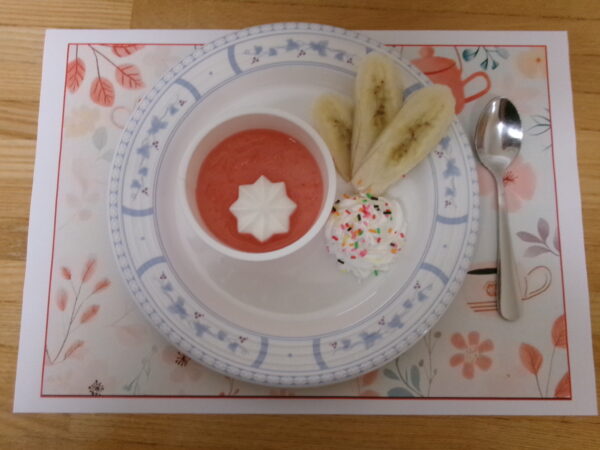 ●さっぱりゼリーと・・。ゼリーの上に“お花のトッピング”とバナナ、ホイップクリームを添えて