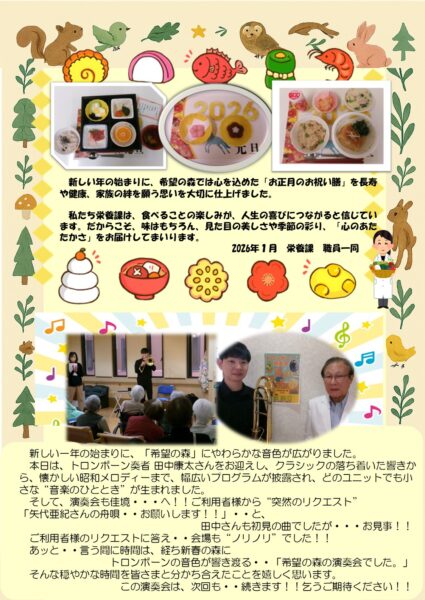 理事長・施設長からのご挨拶をはじめ、栄養課が心を込めてご用意したお正月の特別メニュー、そして各ユニットで開催されたトロンボーン奏者による新春演奏会の様子など、利用者様の笑顔あふれるひとときをご紹介しています。